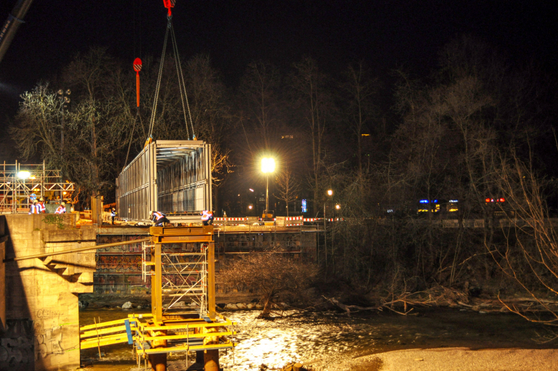 Während der Bauzeit werden die auf den Ludwigsbrücken verlaufenden Geh- und Radwege auf insgesamt sechs Behelfsbrücken umverlegt, die südlich und nördlich der Bestandsbauwerke angeordnet sind. Zwischen dem 22.03. und dem 29.03.2020 wurden diese sechs Behelfsbrücken jeweils in Nachtschichten in Einzelteilen antransportiert, montiert und erfolgreich eingehoben. Für den Einhub der über 60 Tonnen schweren und ca. 50 m langen Behelfsbrücken kamen zwei leistungsfähige Mobilkräne mit Hubkapazitäten von bis zu 450 Tonnen zum Einsatz.