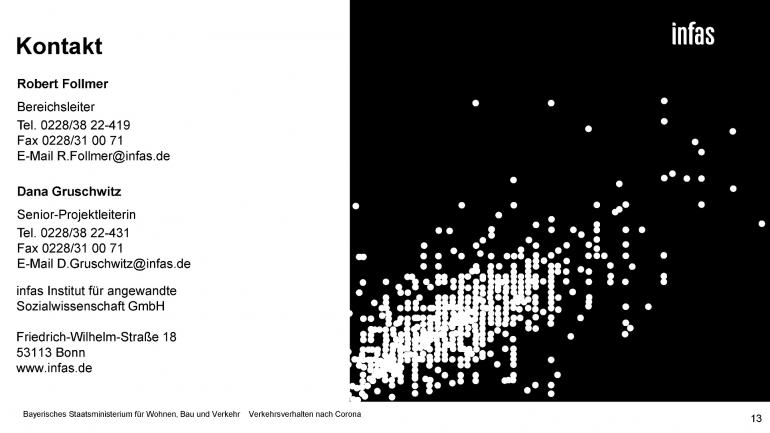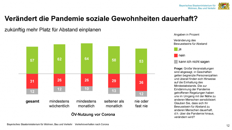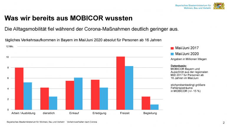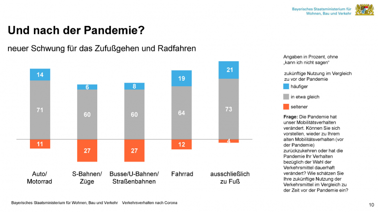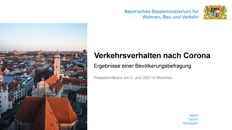 Die Studie „Verkehrsverhalten nach Corona“ hat das infas Institut für angewandte Sozialwissenschaften im Auftrag des Bayerischen Staatsministeriums für Wohnen, Bau und Verkehr erstellt. Dafür wurden 1.554 Menschen ab 18 Jahren in Bayern zu Veränderungen im Mobilitätsverhalten und ihren die Erwartungen an die Alltagsmobilität in einer Zeit nach der Corona-Pandemie befragt. Die Interviews haben als Online-Befragung im April 2021 stattgefunden.