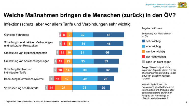 Vom ÖPNV erwarten die Befragten günstige Fahrpreise (80%), attraktive Verbindungen und verkürzte Reisezeiten (79%), die Umsetzung von Hygienekonzepten und Abstandsregeln (77 bzw. 72%) und flexible und individuelle Tarife (71%).