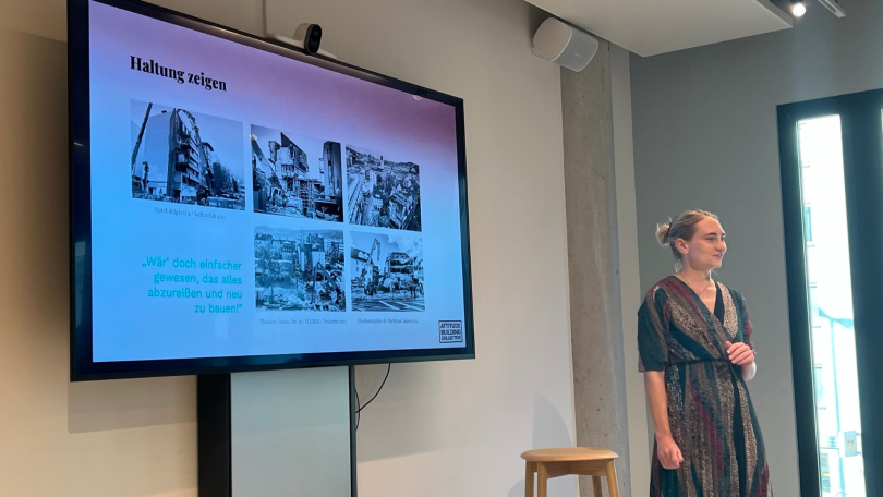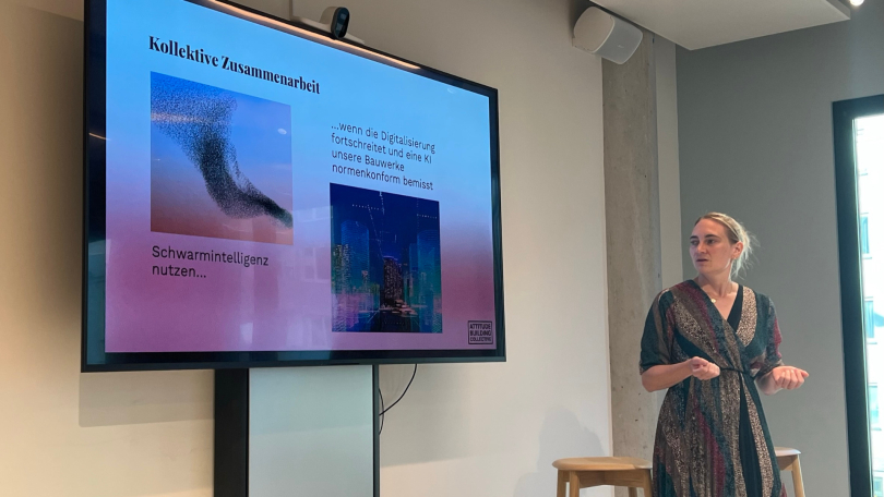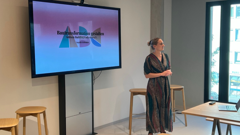 Anschließend stellte Angela Feldmann das Attitude Building Collective ABC vor. Die Initiative hat das Ziel, alle Bauschaffenden für die Transformation im Bauwesen zu mobilisieren, gemeinsam das Bauen weiterzuentwickeln und Impulse für eine sinnhafte und ganzheitlich nachhaltige Bauwirtschaft zu setzen. Von zentraler Bedeutung ist dabei der Dialog mit allen Beteiligten und Interessierten, um ein gemeinsames Wertefundament für unseren Beruf zu entwickeln: