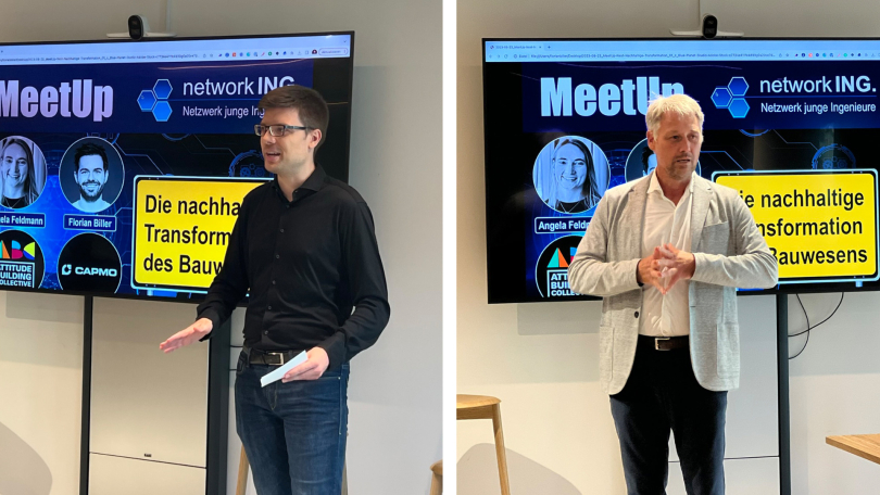 Beim MeetUp unseres Netzwerkes junge Ingenieure am 23. August in München ging es um eine der brennendsten Fragen der Zukunft - die nachhaltige Transformation des Bauwesens. Angela Feldmann stellte das Attitude Building Collective ABC vor. Die Initiative hat das Ziel, alle Bauschaffenden für eine sinnhafte und ganzheitlich nachhaltige Transformation im Bauwesen zu mobilisieren. Florian Biller von Capmo zeigte, wie digitales Baumanagement zur Optimierung der Bauprozesse, dem Einsparen von CO2 und dem Schutz der Umwelt beitragen kann.
