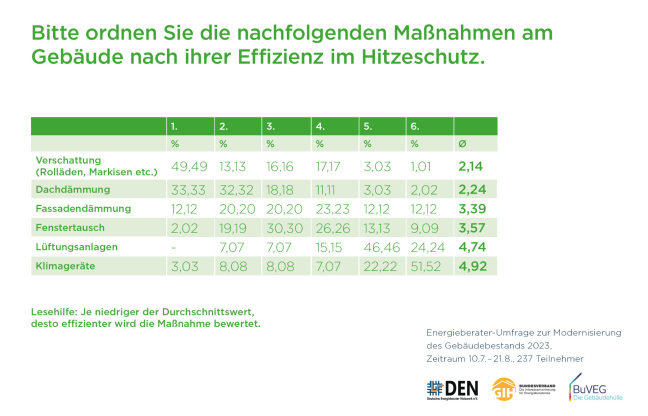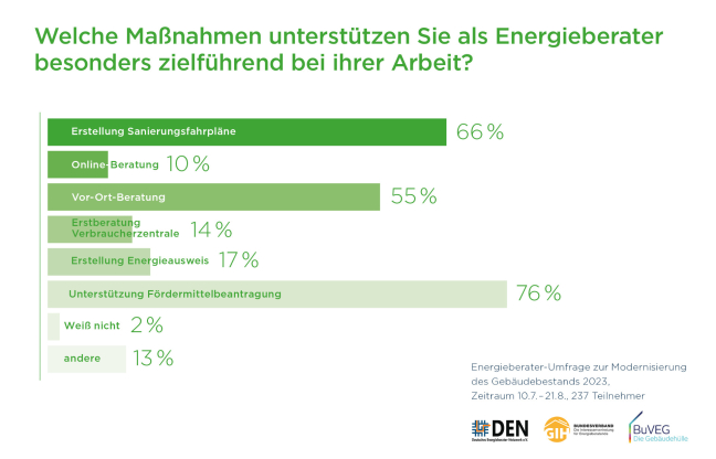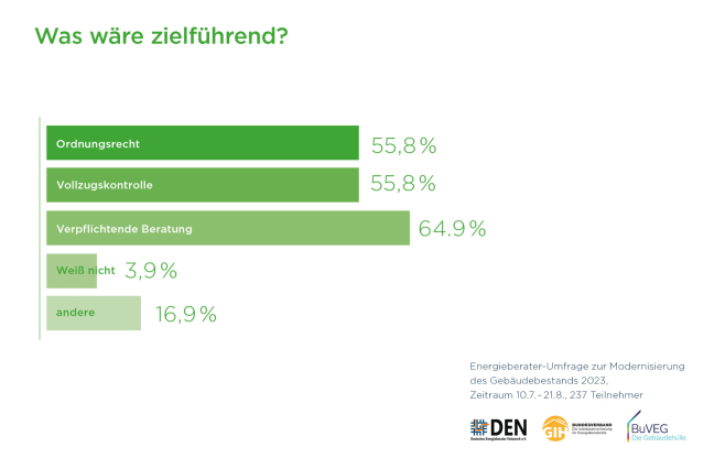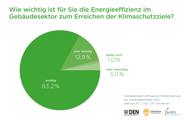 Die Umfrage wurde unter den Mitgliedern des Deutschen Energieberater Netzwerks DEN und des GIH Bundesverbands im Auftrag des Bundesverbands energieeffiziente Gebäudehülle e.V. (BUVEG) durchgeführt.