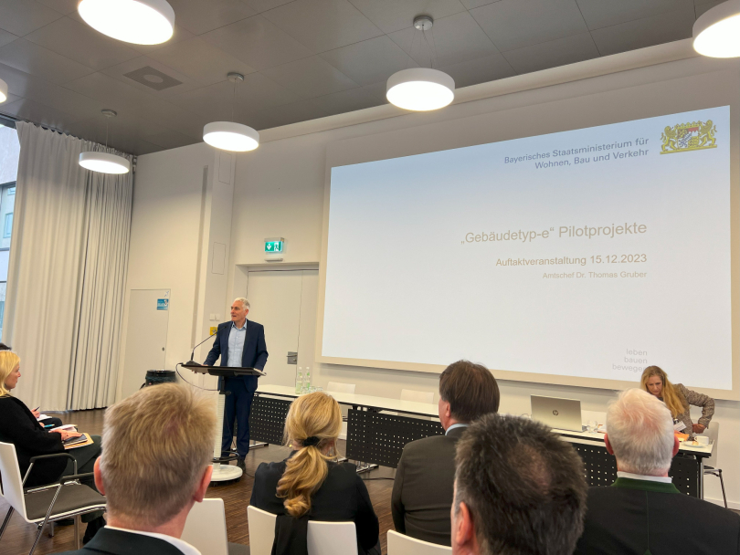 Mehr Spielräume beim Bauen: Die Bayerische Staatsregierung hat mit einer Änderung der Bayerischen Bauordnung (BayBO) im Sommer 2023 einen Grundgedanken des „Gebäudetyps-e“ im öffentlichen Recht umgesetzt. Nun starten in fast allen Regierungsbezirken Pilotprojekte. „Mit dem Erproben des ‚Gebäudetyps-e‘ stärken wir das innovative Bauen“, erklärt Bauminister Christian Bernreiter. Bei der Auftaktveranstaltung am 15.12.2023 im Bauministerium war die Architektenkammer mit Präsidentin Prof. Lydia Haack und die Bayerische Ingenieurekammer-Bau mit Präsident Prof. Dr. Norbert Gebbeken vertreten.