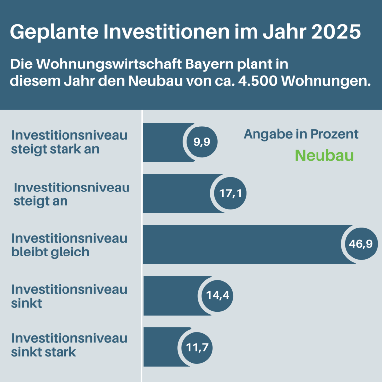 Im Jahr 2025 werden 29 Prozent der Unternehmen mehr Geld in den Wohnungsbau investieren. Insgesamt sind 4.500 bezahlbare Mietwohnungen geplant. Knapp ein Viertel der befragten Unternehmen wird die Investitionen in den Wohnungsbau reduzieren. Die wesentlichen Gründe sind eine unsichere Fördersituation, unzureichende Fördermittel sowie hohe Baukosten und die gestiegenen Zinsen.