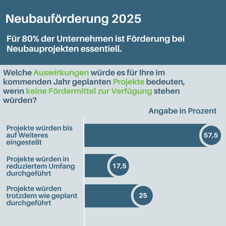 Beim Wohnungsbau sind die Unternehmen auf Fördermittel angewiesen. Rund 80 Prozent der geplanten Neubauprojekte sollen 2025 ganz oder teilweise mit Fördermitteln umgesetzt werden. Für 58 Prozent der Wohnungsunternehmen ist der Neubau ohne Förderung nicht möglich.