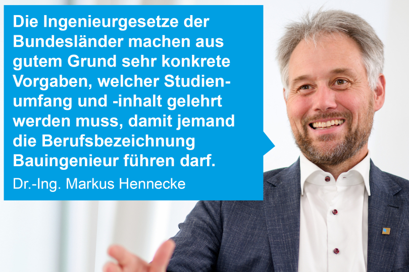Die Ingenieurgesetze der Bundesländer machen aus gutem Grund sehr konkrete Vorgaben, welcher Studienumfang und -inhalt gelehrt werden muss, damit jemand die Berufsbezeichnung Bauingenieur führen darf. Der Beruf des Bauingenieurs ist eng verknüpft mit Dienstleistungen, die im allgemeinen gesellschaftlichen Interesse stehen. Dazu gehören der Schutz von Gesundheit und Leben sowie der natürlichen Lebensgrundlagen.