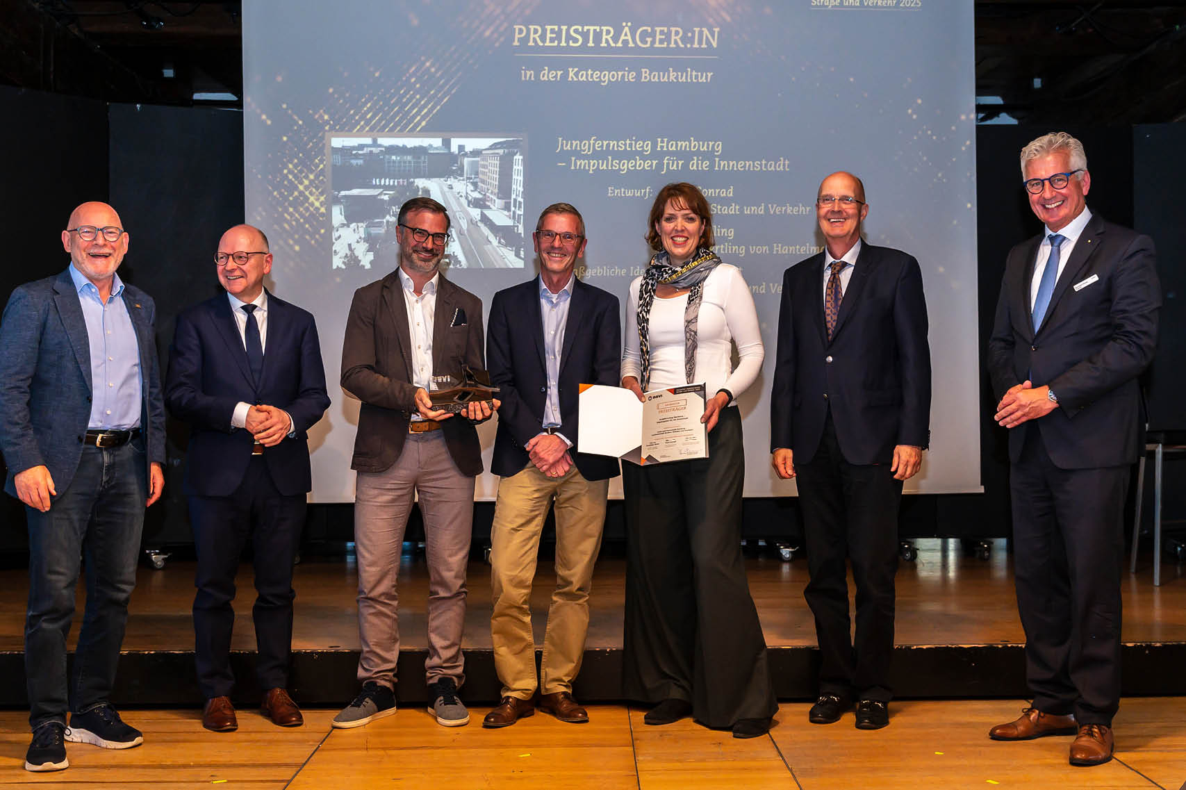 Den Deutschen Ingenieurpreis Straße und Verkehr 2025 in der Kategorie Baukultur gewinnt die Freie und Hansestadt Hamburg - Landesbetrieb Straßen, Brücken und Gewässer für die Umgestaltung des Jungfernstiegs. Im Rahmen der Mobilitätswende wird der Jungfernstieg durch die ARGUS Stadt und Verkehr Partnerschaft mbB zu einem multifunktionalen, klimaresilienten Stadtraum transformiert. Die Jury bewertet insbesondere die konsequente Beruhigung des motorisierten Individualverkehrs, die Stärkung emissionsfreier Mobilität (zu Fuß und mit dem Rad), die Integration barrierefreier Leitsysteme sowie die kooperative Umsetzung der städtebaulichen Maßnahme als vorbildlich. So erfolgte die Planung unter intensiver Beteiligung von Öffentlichkeit und Fachgremien. Ökologisch setzt das Projekt ebenfalls Maßstäbe: Ein innovatives Regenwassermanagement entlastet die Mischwasserkanalisation und fördert die Vitalität der neu gepflanzten Baumreihe. Die Aufenthaltsqualität wird durch gestalterische Elemente, Spielangebote und Möblierungszonen gesteigert.
