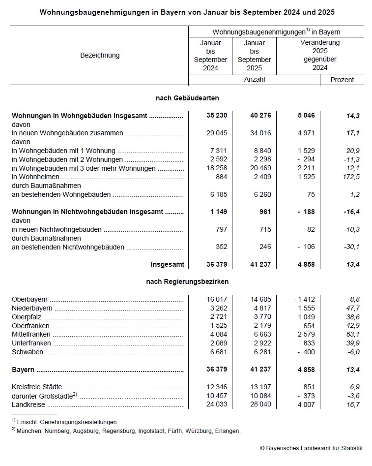 In Bayern werden von Januar bis September 2025 Baugenehmigungen (einschließlich Genehmigungsfreistellungen) für insgesamt 41.237 Wohnungen bewilligt. Nach Mitteilung der Fachgruppe im Bayerischen Landesamt für Statistik steigt die Zahl der Wohnungsbaufreigaben damit um 4 858 Wohnungen beziehungsweise 13,4 Prozent gegenüber dem Vorjahreszeitraum.