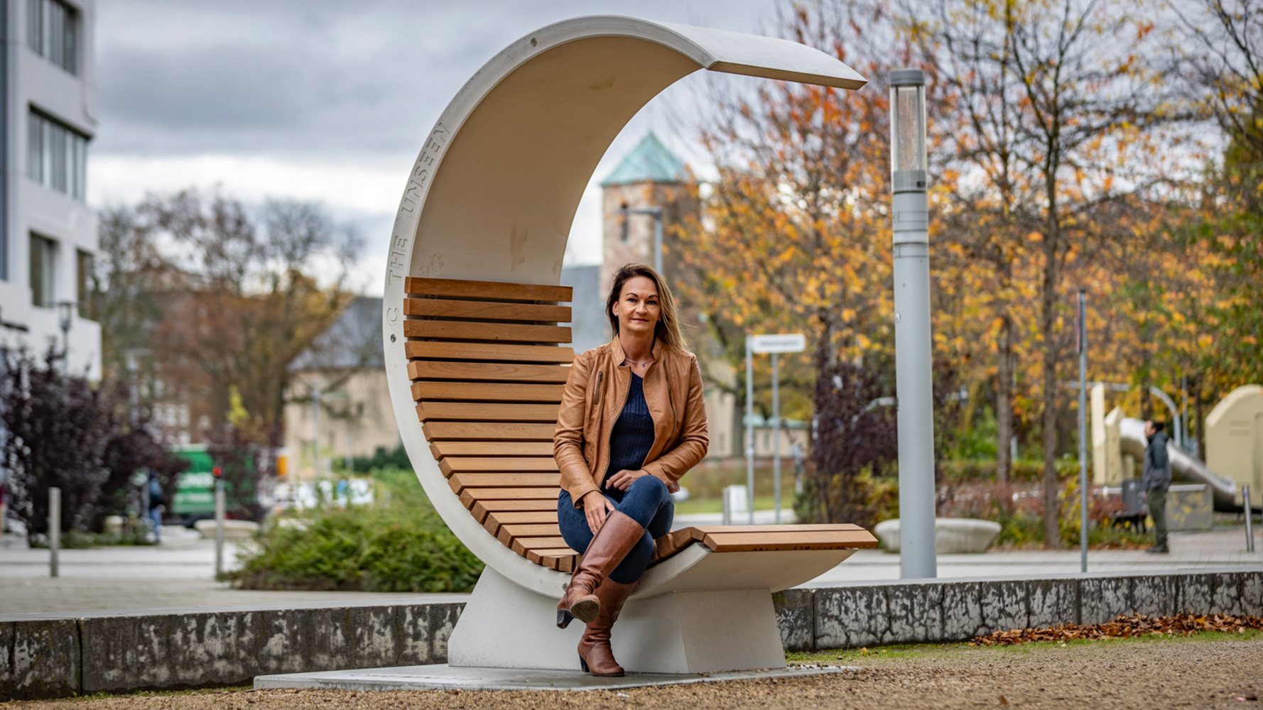 „Der Grundkörper der C-förmigen Stadtmöblierung wurde aus mit Carbongittern bewehrtem Beton hergestellt, um eine dauerhafte, wartungsfreie und filigrane Ausführung zu erhalten“, berichtet Prof. Dr. Sandra Gelbrich, Leiterin des Forschungsbereiches „Leichtbau im Bauwesen“. Zur Umsetzung einer nachhaltigen Sichtbetonqualität seien extra ein hochfester Feinbeton mit CO2-reduziertem Zement sowie ein geeignetes Schalungssystem für den Betonguss entwickelt worden. Die Integration des Schriftzuges „C the unseen“ konnte so bereits beim Gießen in den Betonkörper eingebracht werden.