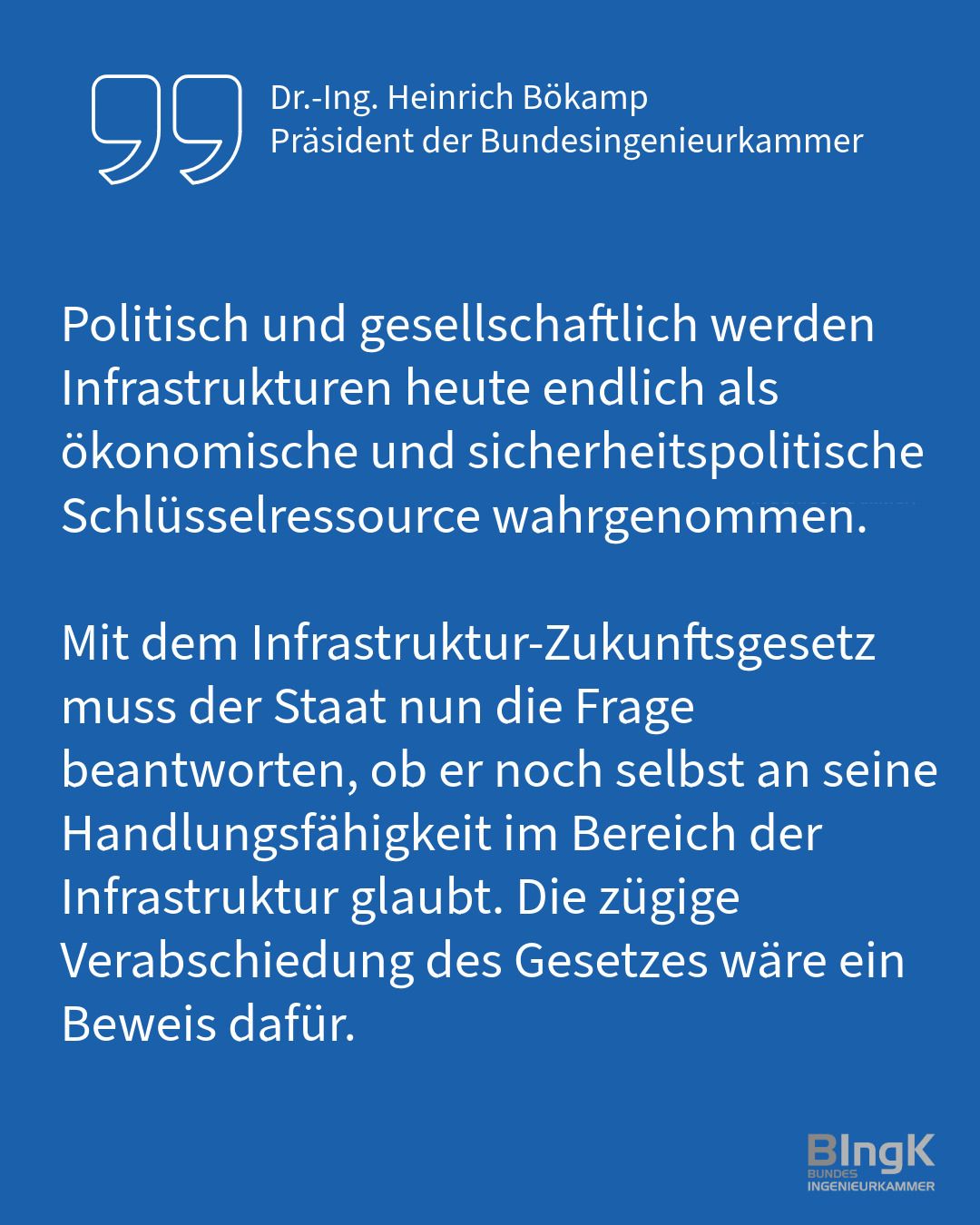 Im Nachgang zur Sitzung des Bundesrates am 30.01.2026 betont Dr.-Ing. Heinrich Bökamp, der Präsident der Bundesingenieurkammer: „Politisch und gesellschaftlich werden Infrastrukturen heute endlich als ökonomische und sicherheitspolitische Schlüsselressource wahrgenommen. Mit dem Infrastruktur-Zukunftsgesetz muss der Staat nun die Frage beantworten, ob er noch selbst an seine Handlungsfähigkeit im Bereich der Infrastruktur glaubt. Die zügige Verabschiedung des Gesetzes wäre ein Beweis dafür."