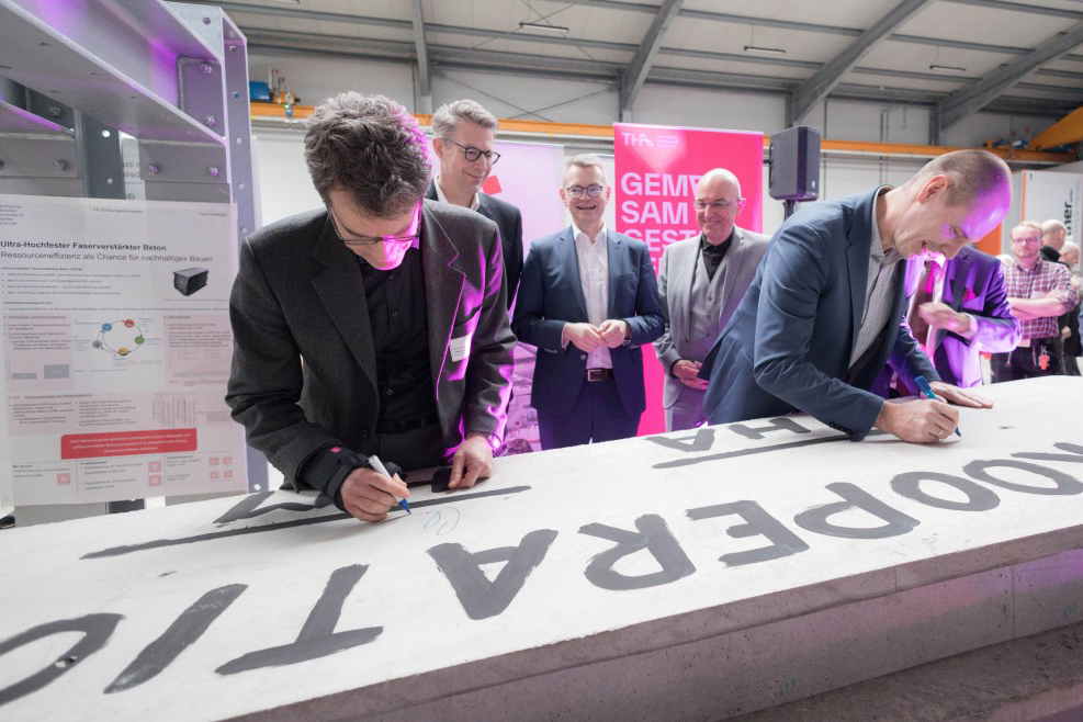 Im Beisein von Bayerns Wissenschaftsminister Markus Blume, MdL unterzeichneten die Vertreter beider Hochschulen symbolisch auf einer eigens entwickelten Carbon-Betonplatte die Kooperationsvereinbarung. Um den Ressourcenverbrauch in Gebäuden zu reduzieren, forscht die THA gemeinsam mit den Firmen LINDERMAYR GmbH & Co. KG und Hitexbau GmbH an querschnittsoptimierten Deckenplatten, die in dieser Form nur mit Carbon-Bewehrung realisiert werden können.