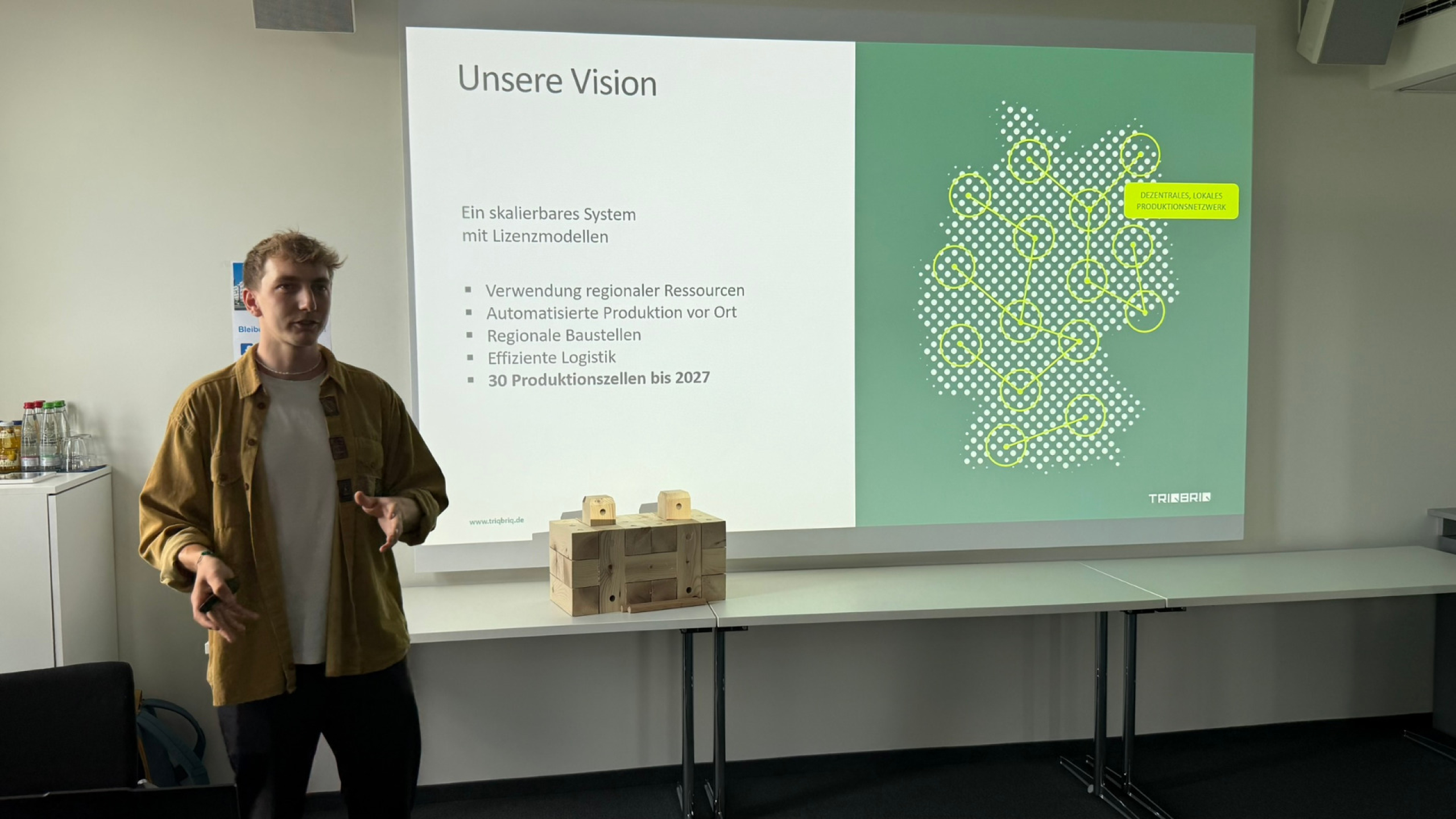 Der Sieger, die TRIQBRIQ AG aus Tübingen, stellt ein Holzbausystem aus modularen Holzbausteinen her. Die „BRIQS“ werden aus Alt- und Schadholz hergestellt und verzichten komplett auf Zusatzstoffe wie Leim oder Harz. Das eingesetzte Material ist damit sortenrein trennbar und kann bei Rück- oder Umbau des Gebäudes im Stoffkreislauf gehalten werden – ein riesiges ökologisches Plus. Die BRIQs werden dezentral in den Sägewerken vor Ort hergestellt und sparen so zusätzlich CO2 ein.