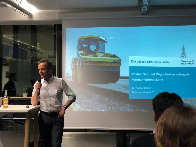 Beim Vortrag von Dr. Burkhard Seizer, Senior Projektpartner bei Drees & Sommer, ging es um den Einsatz der Digitalisierung bei Straßenbaustellen. Nachdem Seizer den Status Quo dargestellt hatte, zeigte er anschließend neue Möglichkeiten bei Straßenbauprojekten durch den Einsatz digitaler Werkzeuge entlang der gesamten Wertschöpfungskette auf - Stichwort Bauprozessoptimierung.