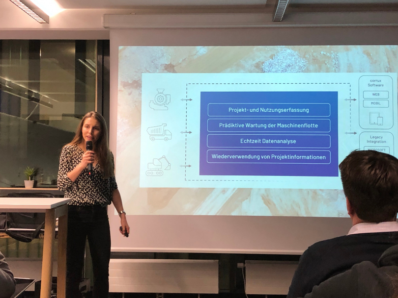 Laura Tönnies, Geschäftsführerin und Inhaberin des Startups Corrux, zeigte, wie man das Internet of Things nutzen kann, um Baumachinendaten zu optimieren, dadurch Baumaschinen optimal zu vernetzen und so bedeutende Effiziensteigerungen zu erreichen. Zentrale Bausteine dafür sind die Projekt- und Nutzungserfassung, die prädiktive Wartung der Maschinenflotte, die Analyse der Daten in Echtzeit und vor allen die konsequente Wiederverwendung der Projektinformationen.