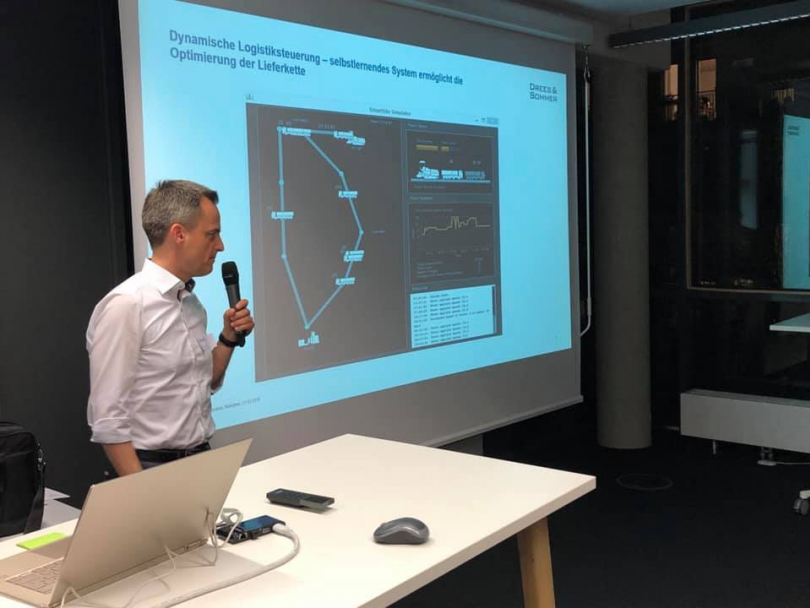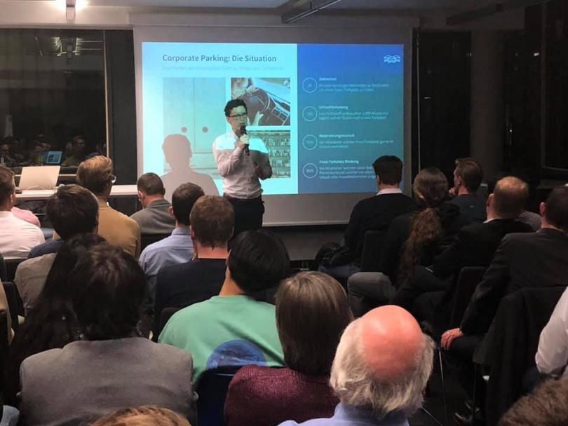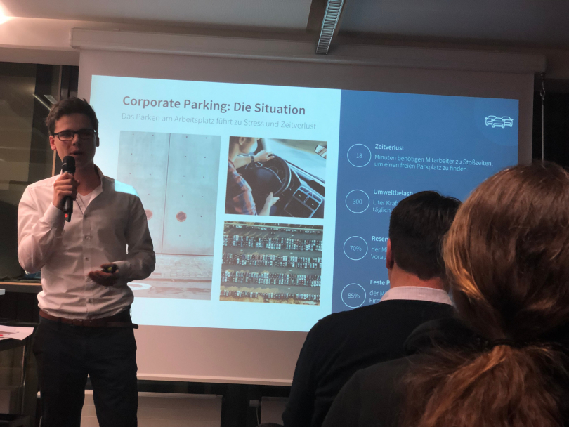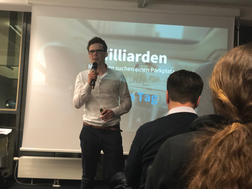 Um die zukünftige Rolle des Parkplatzes in der intermodalen Mobilitätskette ging es im dritten Vortrag des Abends. Felix Harteneck, Geschäftsführer und Inhaber des Startups ParkHere, zeigte, wie sich digitale Werkszeige und lernende Software-Lösungen für eine intelligente Parkraumbewirtschaftung nutzen lassen und welche Vorteile sich dadurch für Unternehmen, Anwohner und Städte allgemein erzielen lassen.