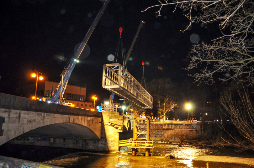 Während der Bauzeit werden die auf den Ludwigsbrücken verlaufenden Geh- und Radwege auf insgesamt sechs Behelfsbrücken umverlegt, die südlich und nördlich der Bestandsbauwerke angeordnet sind. Zwischen dem 22.03. und dem 29.03.2020 wurden diese sechs Behelfsbrücken jeweils in Nachtschichten in Einzelteilen antransportiert, montiert und erfolgreich eingehoben. Für den Einhub der über 60 Tonnen schweren und ca. 50 m langen Behelfsbrücken kamen zwei leistungsfähige Mobilkräne mit Hubkapazitäten von bis zu 450 Tonnen zum Einsatz.
