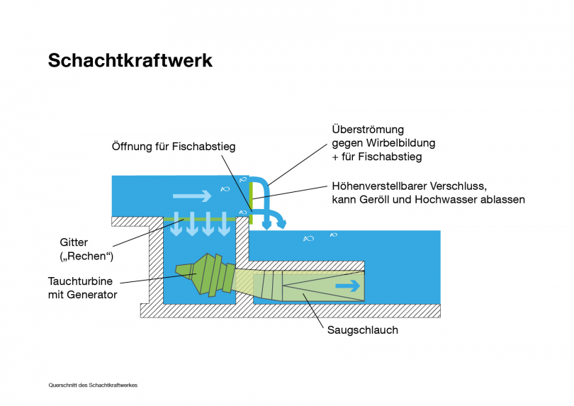 Ein Team am Lehrstuhl für Wasserbau und Wasserwirtschaft der TUM hat deshalb ein Wasserkraftwerk entwickelt, das die Natur deutlich stärker schont. Für den neuen Kraftwerkstyp muss der Flusslauf nicht umgeleitet werden. Stattdessen wird vor einem Wehr ein Schacht ins Flussbett gebaut, in dem Turbine und Generator untergebracht werden. Das Wasser fließt in den Schacht, treibt die Turbine an und wird unter dem Wehr in den Fluss zurückgeleitet. Ein kleinerer Teil fließt über den Schacht und das Wehr hinweg.