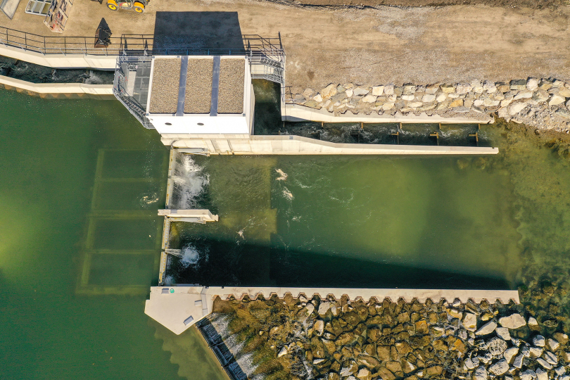 Die Ingenieure haben es geschafft, die Strömung so zu steuern, dass das Kraftwerk effizient Strom erzeugt, aber gleichzeitig der Sog in den Schacht gering ist. Zahlreiche Untersuchungen an einem Prototypen haben gezeigt, dass die meisten Fische deshalb sicher über dem Schacht schwimmen. Mehr noch: Durch zwei Öffnungen im Wehr können sie gefahrlos flussabwärts wandern. Flussaufwärts gelangen sie über eine übliche Fischtreppe