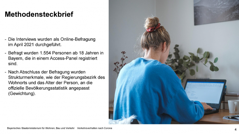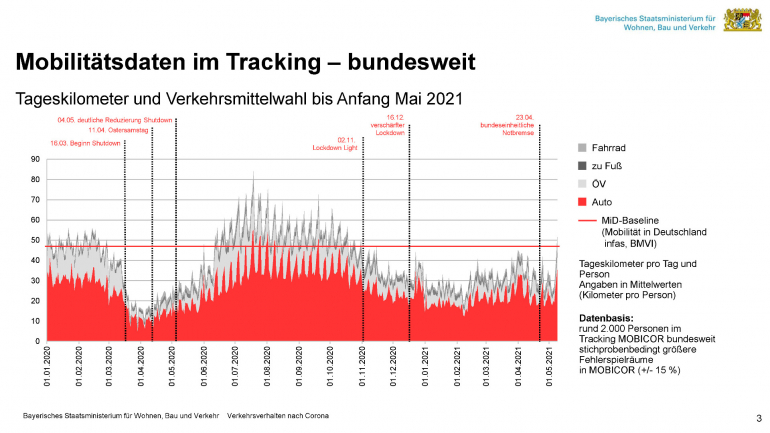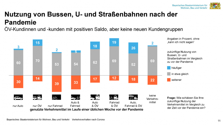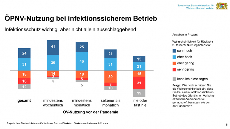 Die Studie „Verkehrsverhalten nach Corona“ hat das infas Institut für angewandte Sozialwissenschaften im Auftrag des Bayerischen Staatsministeriums für Wohnen, Bau und Verkehr erstellt. Dafür wurden 1.554 Menschen ab 18 Jahren in Bayern zu Veränderungen im Mobilitätsverhalten und ihren die Erwartungen an die Alltagsmobilität in einer Zeit nach der Corona-Pandemie befragt. Die Interviews haben als Online-Befragung im April 2021 stattgefunden.