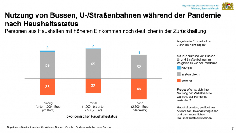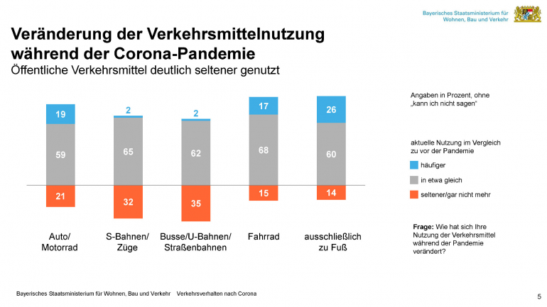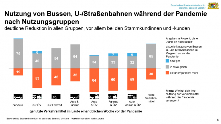 Die Studie belegt: Durch die Pandemie hat sich die Mobilität der Befragten unabhängig vom Verkehrsmittel insgesamt verringert, da viele Wege weggefallen sind. Den Öffentlichen Personennahverkehr (ÖPNV) hat laut Studie etwa ein Drittel (32 - 35%) der Befragten weniger genutzt, bei den Stammkunden ist es ein Minus von rund der Hälfte (43 – 64%).