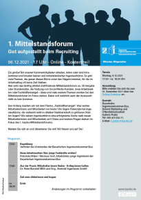 Bei unserem 1. Mittelstandsforum am 06.12.2021 ging es um das Thema „Fachkräftemangel und Recruiting“. Was wollen die Mitarbeiter/innen von heute? Wo liegen Potenziale bei Ingenieurbüros im ländlichen Raum? Wie setzen Ingenieurbüros eine erfolgreiche Suche nach neuen Mitarbeiter/innen um? Sehen Sie die Vorträge "Neue Arbeitswelten: Was junge Fachkräfte wollen" und "Mitarbeiter/innen finden - Kolleg/innen halten" jetzt hier im Video - kostenfrei!
