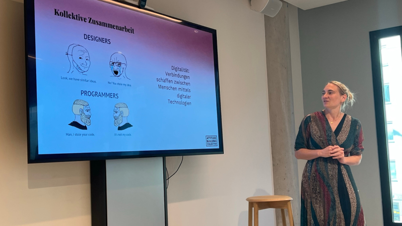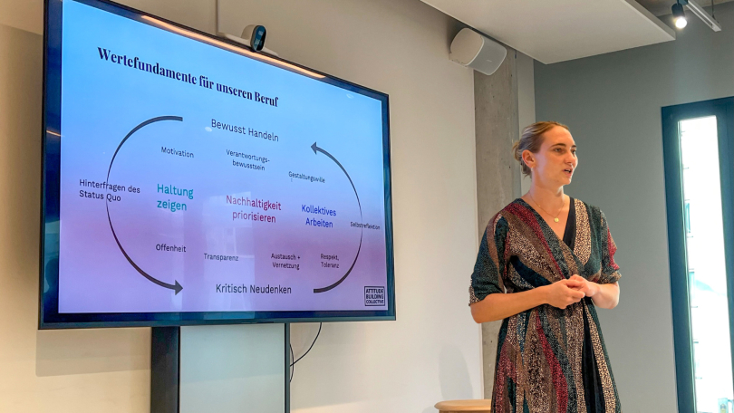Anschließend stellte Angela Feldmann das Attitude Building Collective ABC vor. Die Initiative hat das Ziel, alle Bauschaffenden für die Transformation im Bauwesen zu mobilisieren, gemeinsam das Bauen weiterzuentwickeln und Impulse für eine sinnhafte und ganzheitlich nachhaltige Bauwirtschaft zu setzen. Von zentraler Bedeutung ist dabei der Dialog mit allen Beteiligten und Interessierten, um ein gemeinsames Wertefundament für unseren Beruf zu entwickeln: