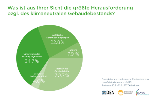 Zusammenfassend beurteilen die Energieberatenden das Vorankommen der Bundesregierung im Gebäudesektor insgesamt mit fast 70 Prozent als "schlecht", ebenso meinen rund 70 Prozent, dass bis 2045 Klimaneutralität nicht erreicht werden kann. Dies hat sich über die letzten drei Jahre der Befragung verstetigt. Einhellig bescheinigen die Experten, dass beim Gebäudebestand in Deutschland Maßnahmen an der Gebäudehülle den größten Nachholbedarf haben.