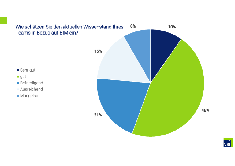 Über 50 % der Teilnehmenden schätzen den Wissensstand in ihren Teams als sehr gut oder gut ein. Dennoch besteht hier noch Luft nach oben, um eine flächendeckend hohe Kompetenz im Umgang mit BIM zu erreichen.