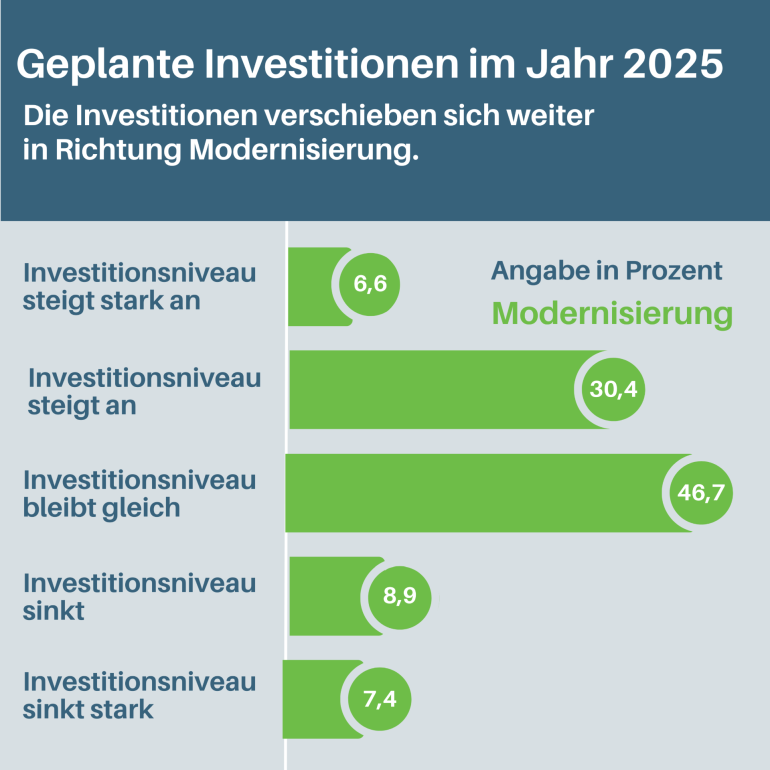 Im Jahr 2025 werden 29 Prozent der Unternehmen mehr Geld in den Wohnungsbau investieren. Insgesamt sind 4.500 bezahlbare Mietwohnungen geplant. Knapp ein Viertel der befragten Unternehmen wird die Investitionen in den Wohnungsbau reduzieren. Die wesentlichen Gründe sind eine unsichere Fördersituation, unzureichende Fördermittel sowie hohe Baukosten und die gestiegenen Zinsen.