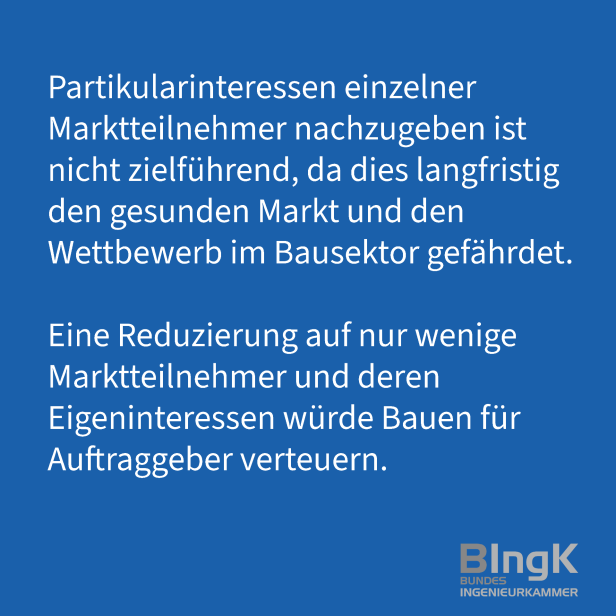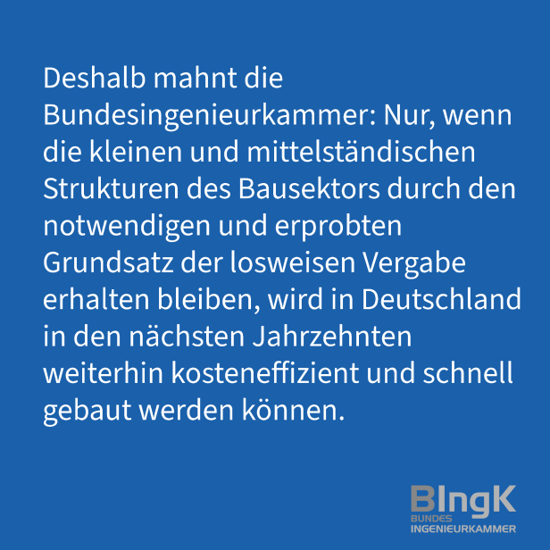 Deshalb mahnt die Bundesingenieurkammer: Nur, wenn die kleinen und mittelständischen Strukturen des Bausektors durch den notwendigen und erprobten Grundsatz der losweisen Vergabe erhalten bleiben, wird in Deutschland in den nächsten Jahrzehnten weiterhin kosteneffizient und schnell gebaut werden können.
