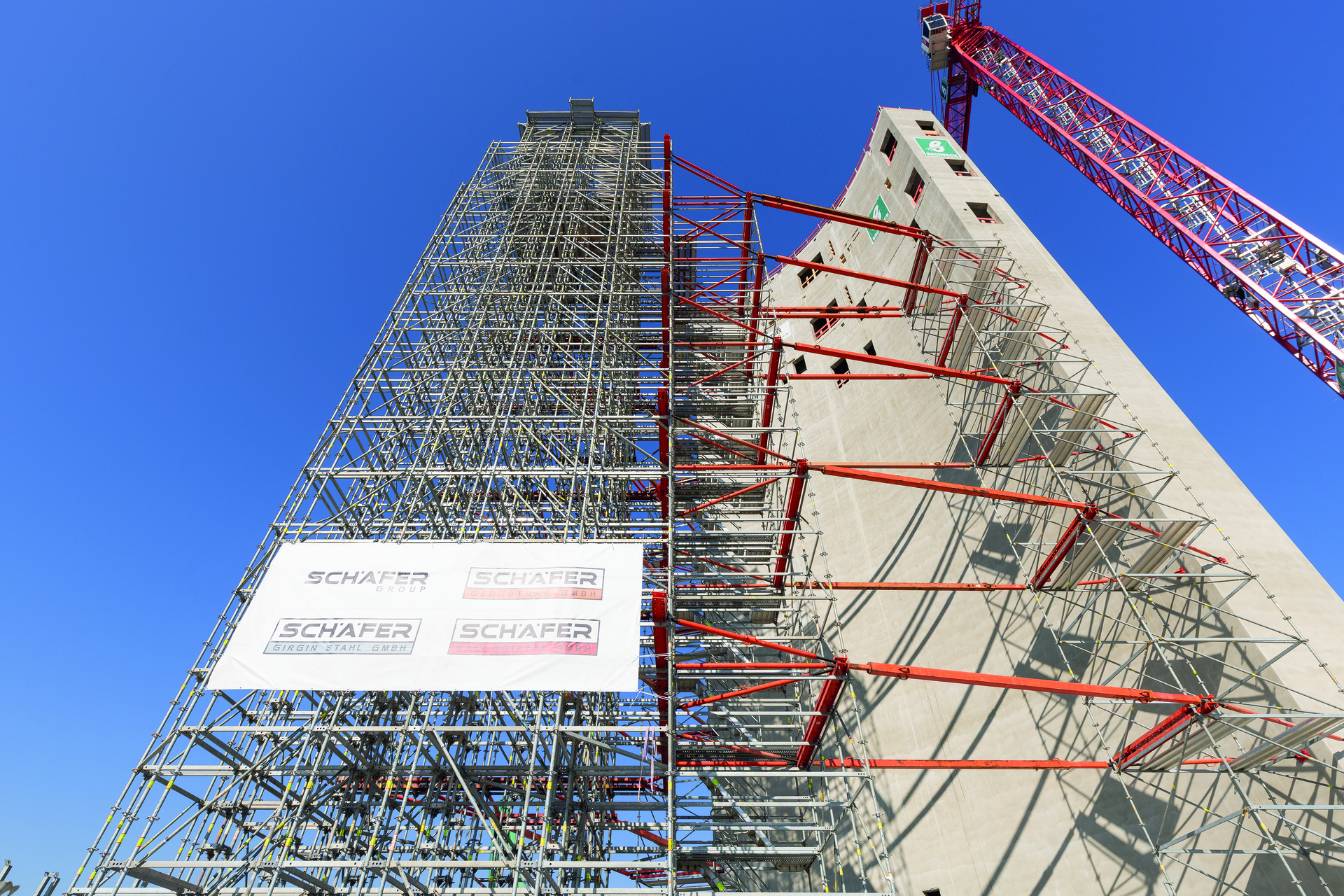 Mittels Systembauteilen des VARIOKIT Ingenieurbaukastens wurden fünf Aussteifungsebenen ausgebildet, die Horizontallasten konnten dabei zuverlässig in den außenliegenden Stahlbetonkern abgeleitet werden. Gleichzeitig hielt die trotz der rund 1.400 kN Traglast äußerst schlank ausgeführte Gerüstkonstruktion die Sockelebene frei für die notwendigen Hubarbeitsbühnen.