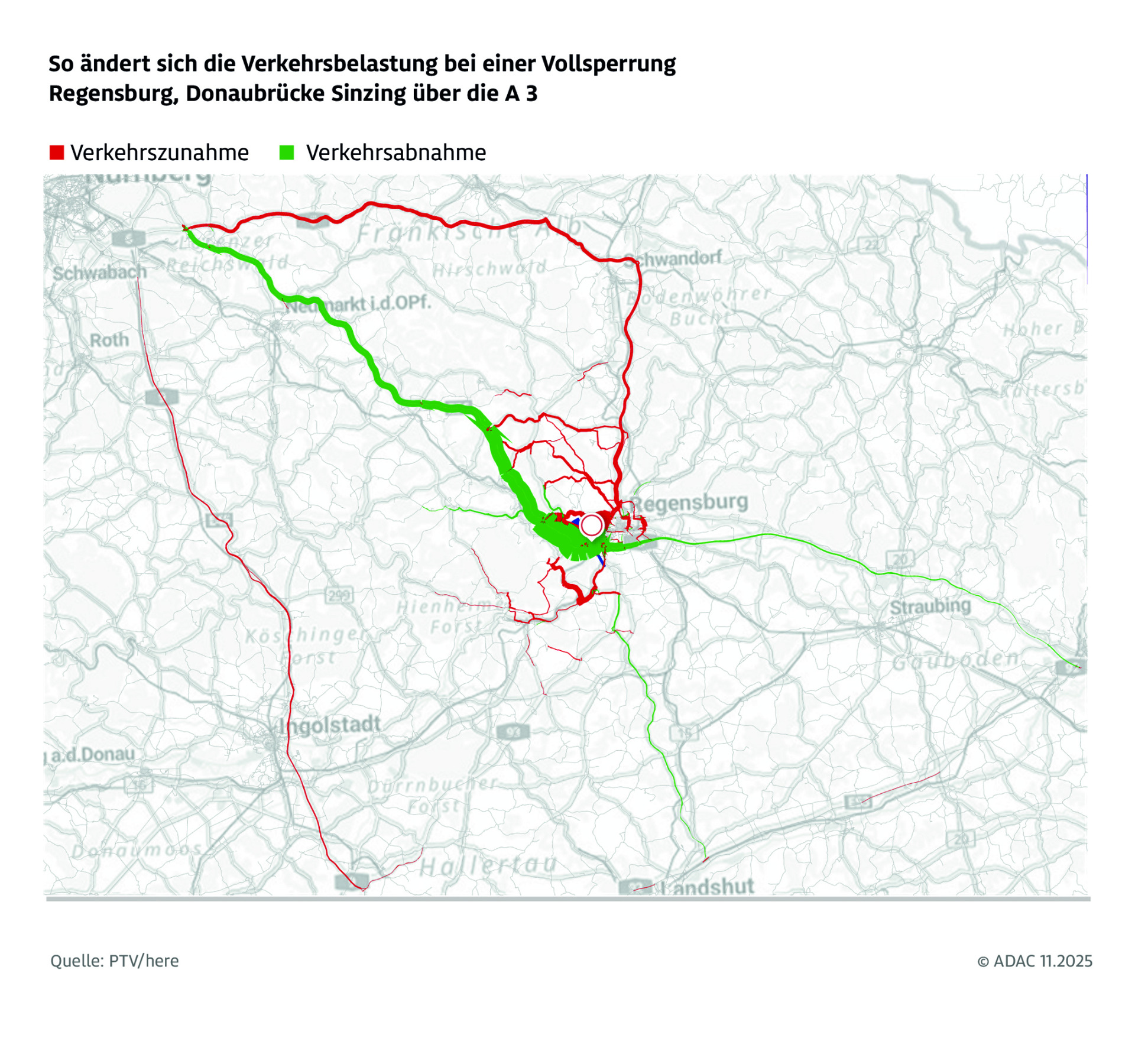 Die Analyse zeigt: Schon eine temporäre Sperrung der Brücke würde Verkehrsverlagerungen über weite Teile des bayerischen Autobahnnetzes nach sich ziehen – etwa auf die A6 oder A93. Die Folge: Umwege, Staus und deutlich längere Fahrzeiten.