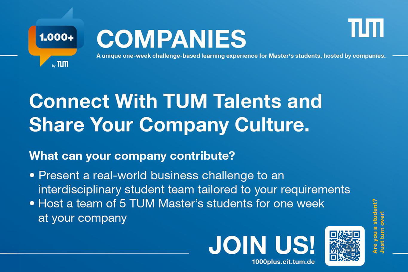 Profitieren auch Sie von dem neuen Projekt der TUM und nutzen Sie 1.000+, um Nachwuchstalente zu finden und für Ihr Unternehmen zu begeistern.