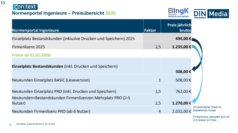 Auf Grundlage einer Rahmenvereinbarung der Bundesingenieurkammer mit der DIN Media GmbH (ehemals Beuth Verlag) stehen den Mitgliedern der Länderkammern mit dem Normenportal für Ingenieure rund 500 für das Ingenieurwesen relevante aus allen Fachbereichen vergünstigt zur Verfügung. Das Normenportal wurde jetzt anwenderfreundlich auf XML-Dokumente mit neuen zusätzlichen Funktionen umgestellt und steht während eines 14-tägigen, kostenfreien Testzeitraums als Leseversion allen interessierten Kammermitgliedern zur Verfügung.