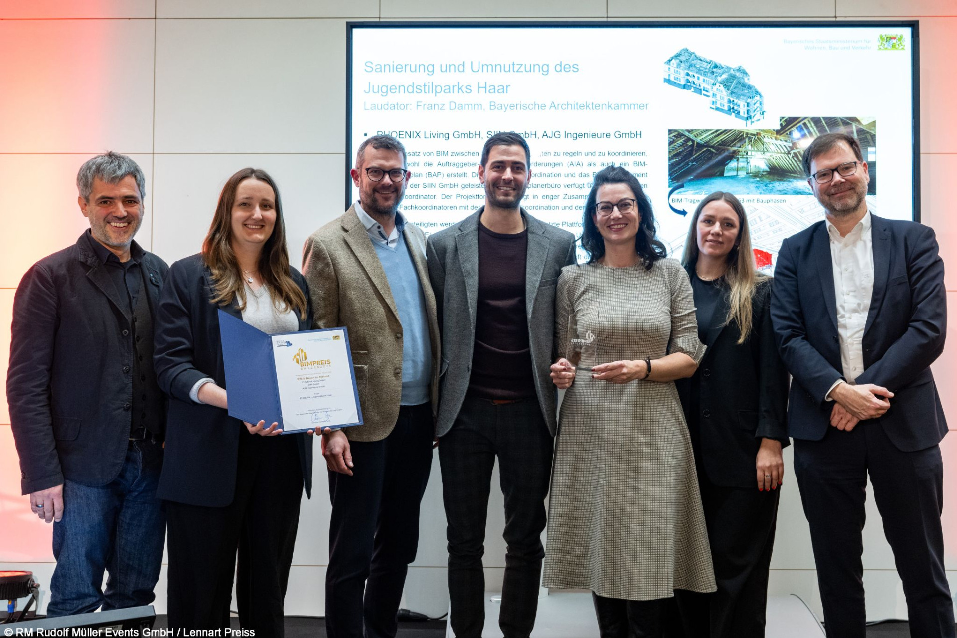 Die PHOENIX Living GmbH & SIIN GmbH & AJG Ingenieure GmbH wurde für den „Jugendstilpark Haar“ ausgezeichnet: Das Projekt demonstriert den gezielten Einsatz von BIM in der Tragwerksplanung beim Bauen im Bestand. Durch die Kombination von Vermessungspunktwolke, Bestandsplänen und modellbasierter Tragwerksplanung wird ein über 100 Jahre altes Gebäudeensemble präzise erfasst und eine sichere Grundlage für dessen Umnutzung geschaffen. Die interdisziplinäre Zusammenarbeit fördert klare Kommunikation, hohe Planungsqualität und einen innovativen Umgang mit dem Bestand, wodurch der Mehrwert von BIM in der Tragwerksplanung überzeugend aufgezeigt wird.