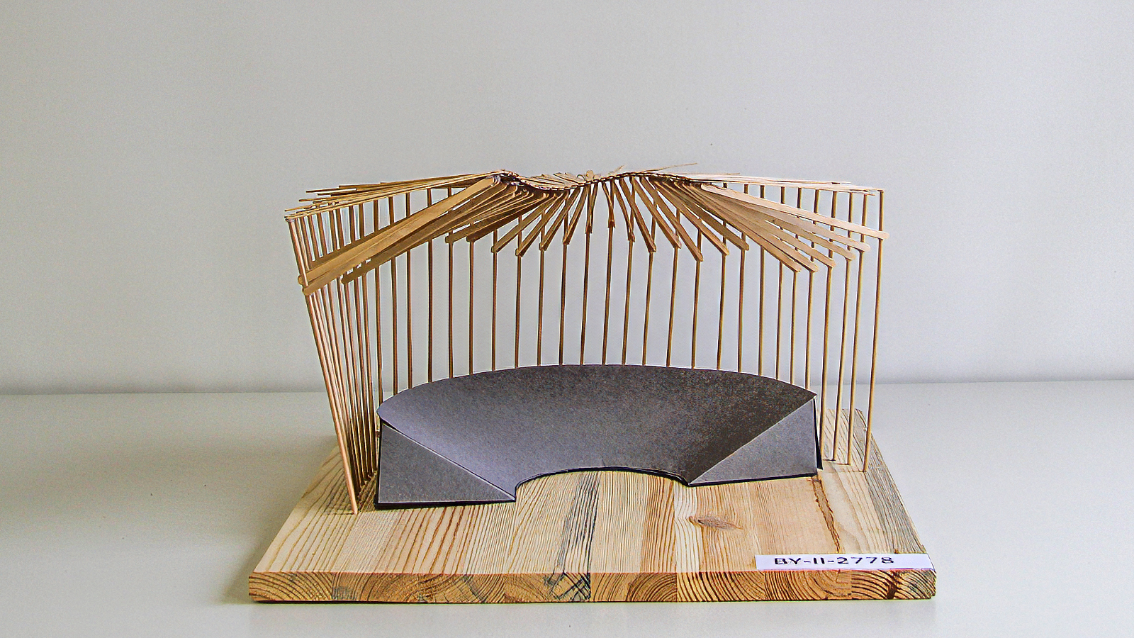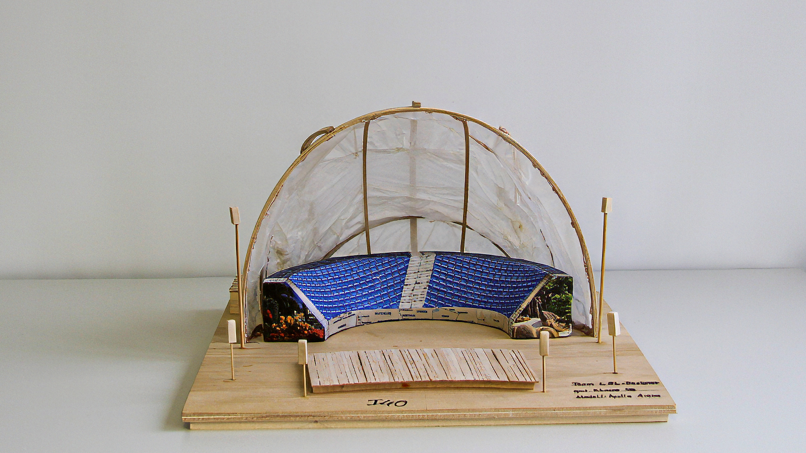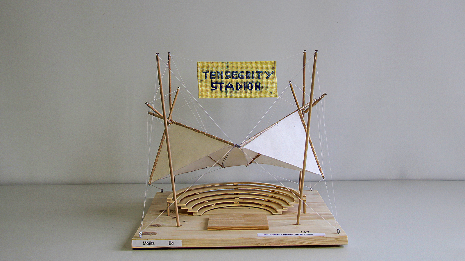 Klar erkennbar und gut herausgearbeitet ist die Tragstruktur des Modells „Hab no koan Nama“. Die beiden gegenläufigen, geneigten Doppelbögen stabilisieren sich gegenseitig und bilden das tragwerkplanerische Grundgerüst der Arena. Drei weitere Bögen halten ein elegantes Dach aus Stoff. Die Dachkonstruktion hat die Anmutung eines Zirkuszeltes. Während bei den meisten anderen Modellen das Dach von unten gestützt wird, hat Finn sein Stoffdach mit Fäden nach oben gezogen und mit den Holzbögen verbunden. Das Modell ist optimal vor allen Witterungseinflüssen geschützt, was auch Teil der Aufgabenstellung war.