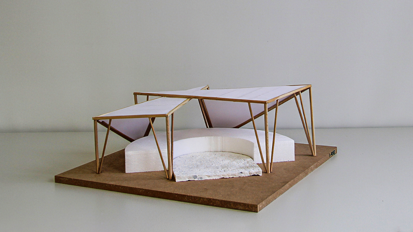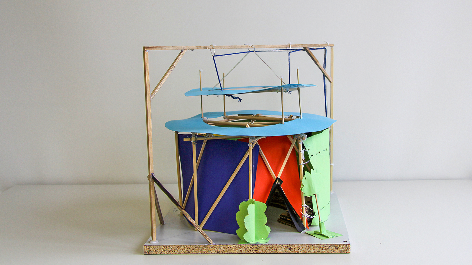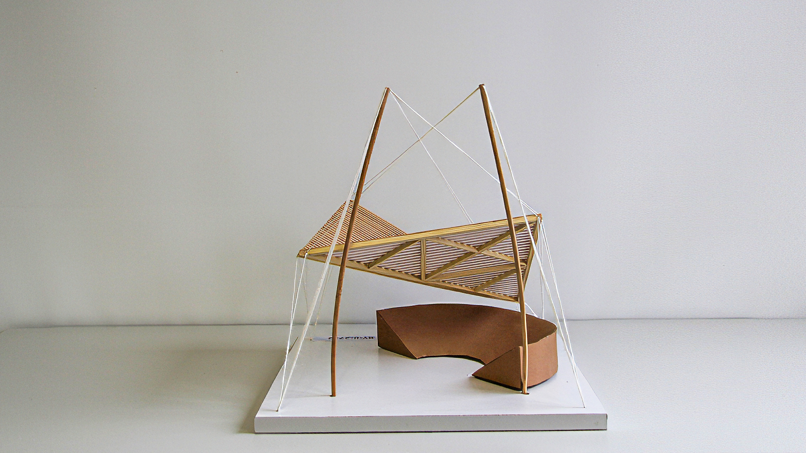 Klar erkennbar und gut herausgearbeitet ist die Tragstruktur des Modells „Hab no koan Nama“. Die beiden gegenläufigen, geneigten Doppelbögen stabilisieren sich gegenseitig und bilden das tragwerkplanerische Grundgerüst der Arena. Drei weitere Bögen halten ein elegantes Dach aus Stoff. Die Dachkonstruktion hat die Anmutung eines Zirkuszeltes. Während bei den meisten anderen Modellen das Dach von unten gestützt wird, hat Finn sein Stoffdach mit Fäden nach oben gezogen und mit den Holzbögen verbunden. Das Modell ist optimal vor allen Witterungseinflüssen geschützt, was auch Teil der Aufgabenstellung war.