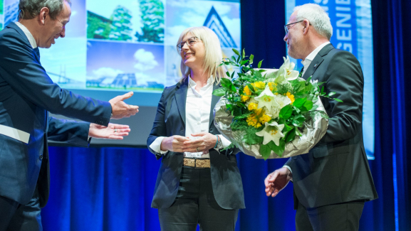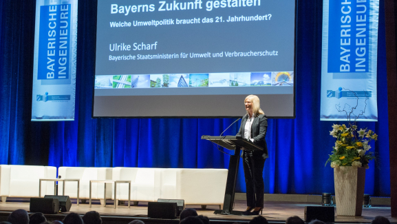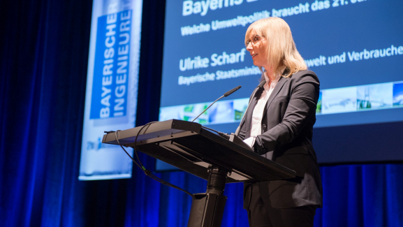 Anschließende hielt Ulrike Scharf, die Bayerische Staatsministerin für Umwelt und Verbraucherschutz, das Grußwort. Dabei ging die Staatsministerin in Ihrem Vortrag "Bayerns Zukunft gestalten: Welche Umweltpolitik braucht das 21. Jahrhundert?" besonders darauf ein, was die Menschen für ein "gutes Leben" brauchen und erwarten. Gerade dafür sei die Bedeutung der am Bau tätigen Ingenieure für eine funktionierende und nachhaltig gestaltete Umwelt und Gesundheit nicht zu unterschätzen, betonte sie.
