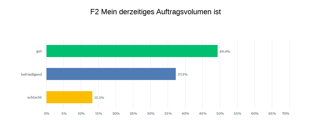 Ähnlich sieht es bei der Auftragslage aus. Das derzeitige Auftragsvolumen bewerten 49,4 Prozent als gut (2025: 53,1 Prozent), 37,3 Prozent als befriedigend (2025: 35,9 Prozent) und 13,3 Prozent als schlecht (2025: 10,9 Prozent).