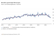 | | Im 1. Halbjahr 2023 wurde in Deutschland der Bau von 135.200 Wohnungen genehmigt. Wie das Statistische Bundesamt (Destatis) mitteilt, waren das 27,2 % oder 50.600 Baugenehmigungen weniger als im 1. Halbjahr 2022. Im Juni 2023 ist die Zahl der Baugenehmigungen für Wohnungen gegenüber dem Vorjahresmonat um 28,5 % gesunken. Dies entspricht einem Rückgang um 8.700 Wohnungen auf 21.800 Wohnungen. Mehr Infos |