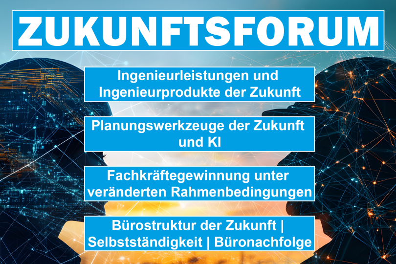 Mit dem Zukunftsforum möchte die Bayerische Ingenieurekammer-Bau ihren Mitgliedern Orientierung zu den vielen drängenden Fragen zur Arbeitswelt und Baubranche der Zukunft geben und mögliche Herangehensweisen und Alternativen im Umgang mit den unterschiedlichen Herausforderungen aufzeigen.